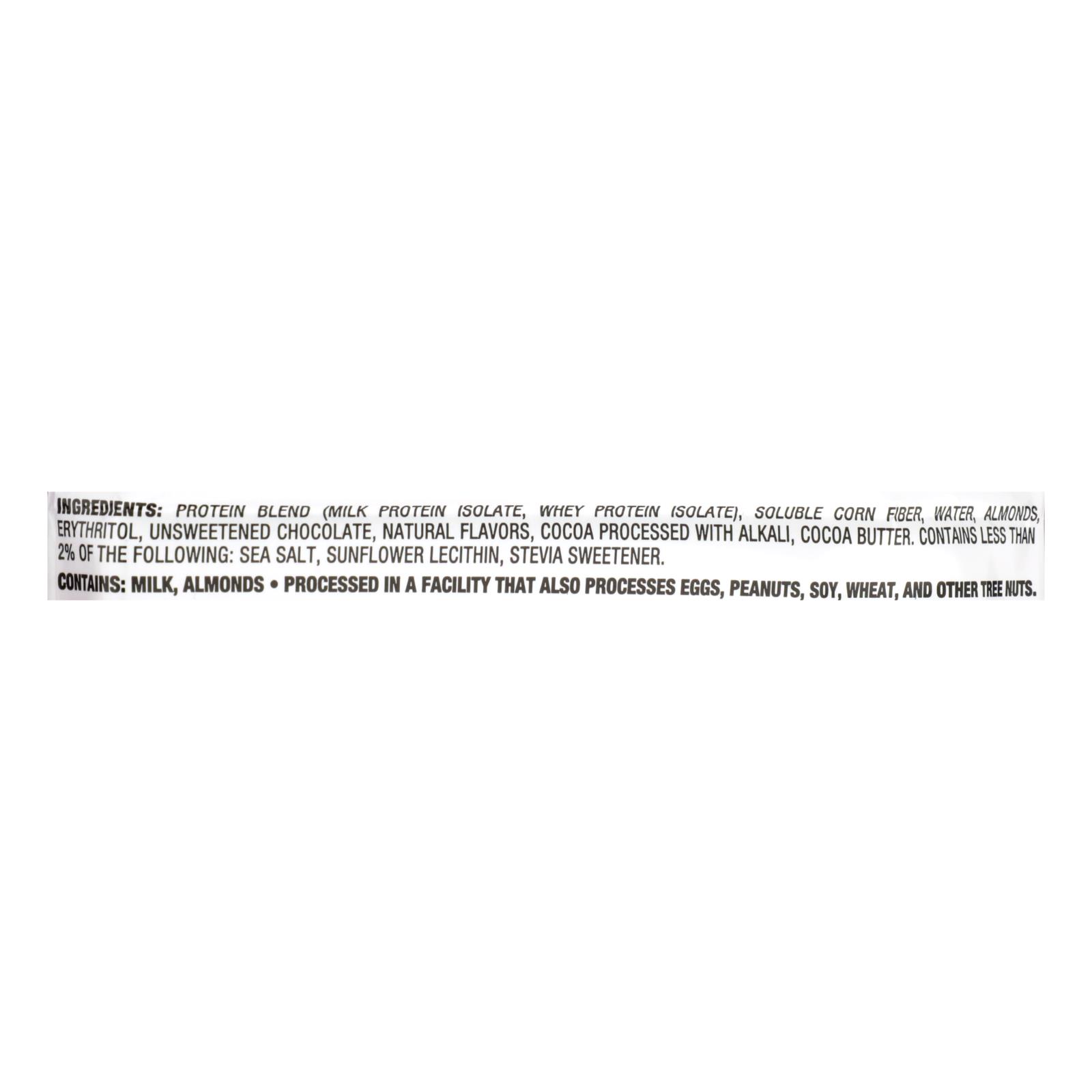 ingredients : protein blend;milk protein isolate;whey protein isolate;soluble corn fiber;water;almonds;erythritol;unsweetened chocolate;natural flavors;cocoa processed with alkali;cocoa butter. Contains less than 2% of the following: sea salt;sunflower lecithin;stevia sweetener