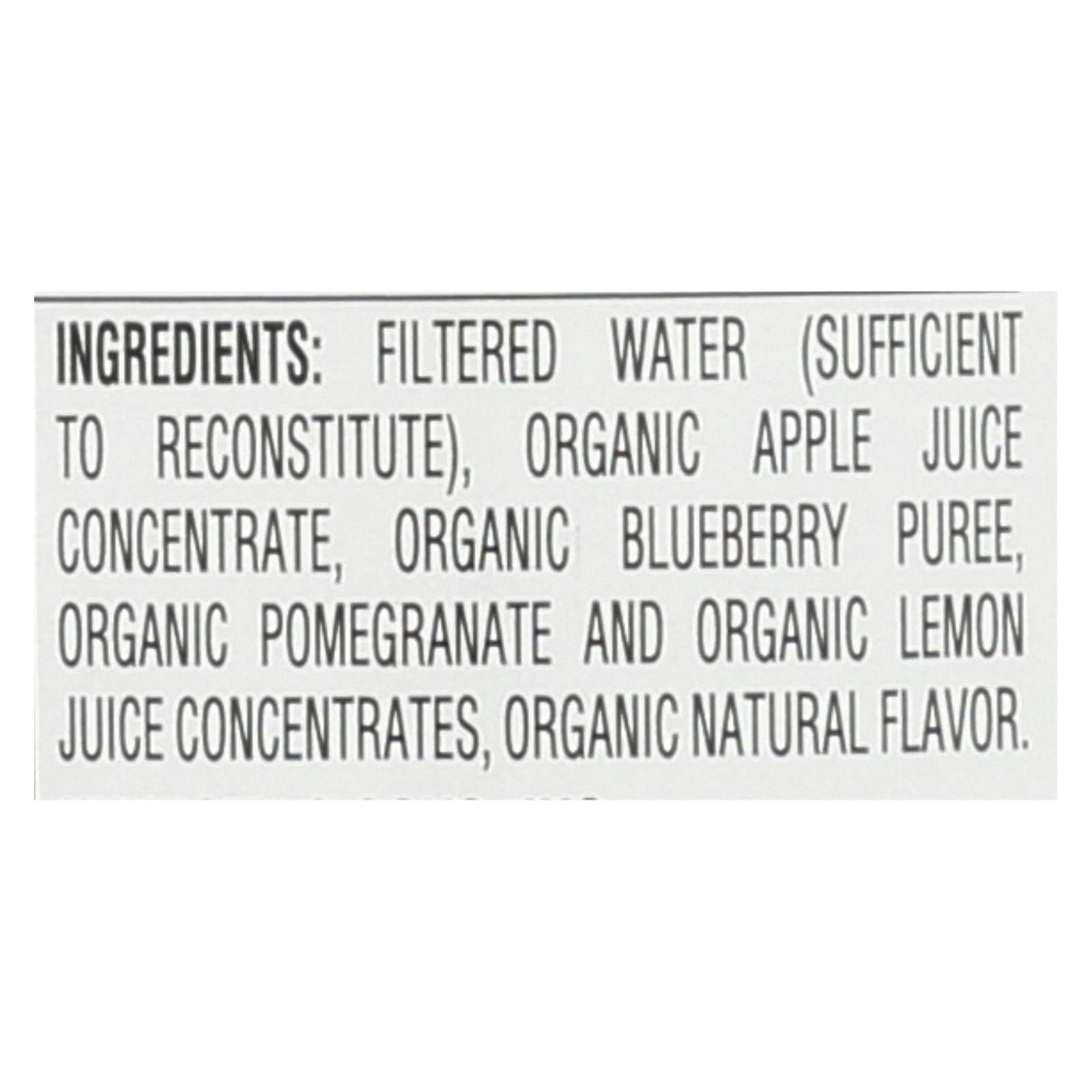 ingredients : filtered water (sufficient to reconstitute);organic apple juice concentrate;organic blueberry puree;organic pomegranate and organic lemon juice concentrates;organic natural flavor