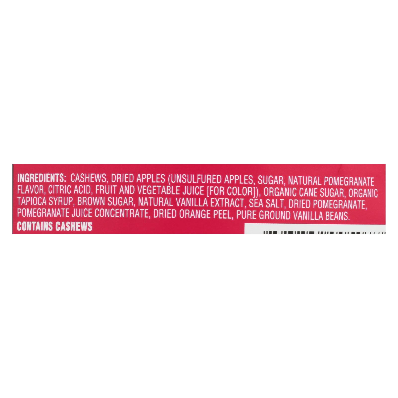 ingredients : cashews;pomegranate flavored dried apples;apples;sugar;natural flavor;citric acid;fruit and vegetable juice [for color];organic cane sugar;organic tapioca syrup;brown sugar;sea salt;pomegranate juice concentrate;dried orange peel;dried pomegranate;vanilla extract;ground vanilla beans