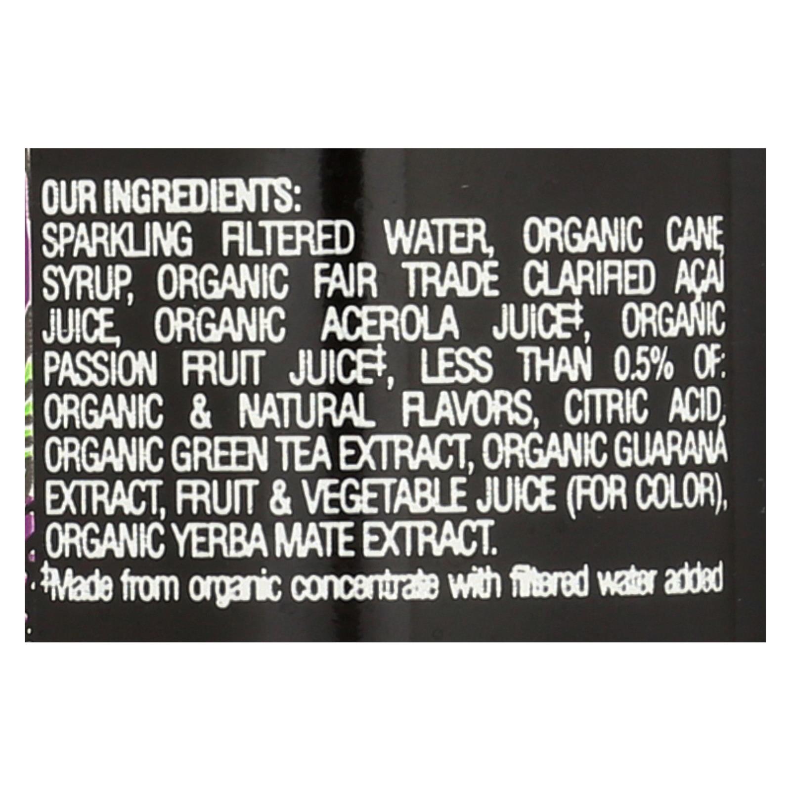 ingredients : our : sparkling filtered water;organic cane syrup;organic fair trade clarified açaí juice;organic acerola juice‡;organic passion fruit juice‡;less than 0.5% of: organic & natural flavors;citric acid;organic green tea extract;organic guarana extract;fruit & vegetable juice;for color;organic yerba mate extract