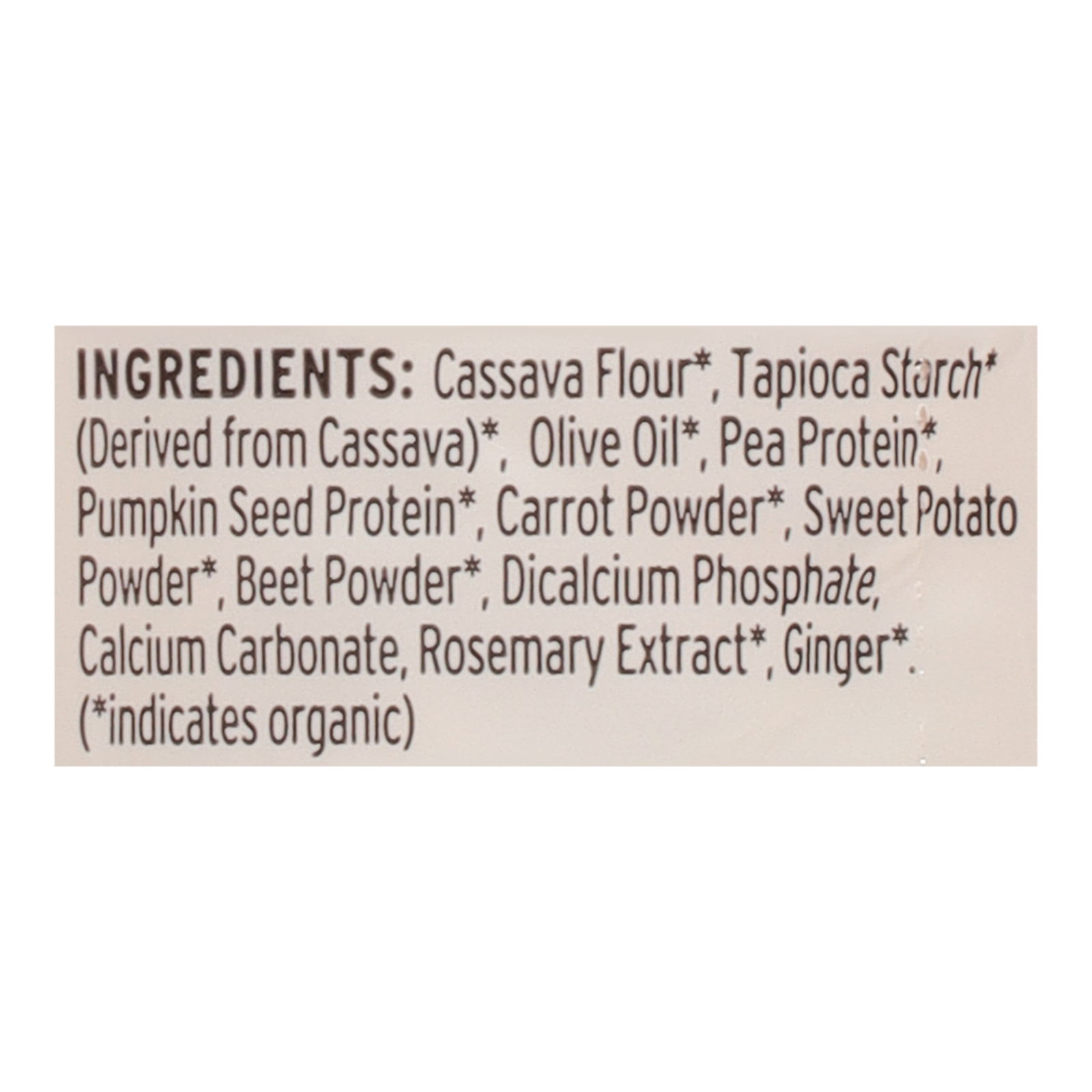 ingredients : cassava flour;tapioca starch* (derived from cassava);olive oil;pea protein;pumpkin seed protein;carrot powder;sweet potato powder;beet powder;dicalcium phosphate;calcium carbonate;rosemary extract;ginger