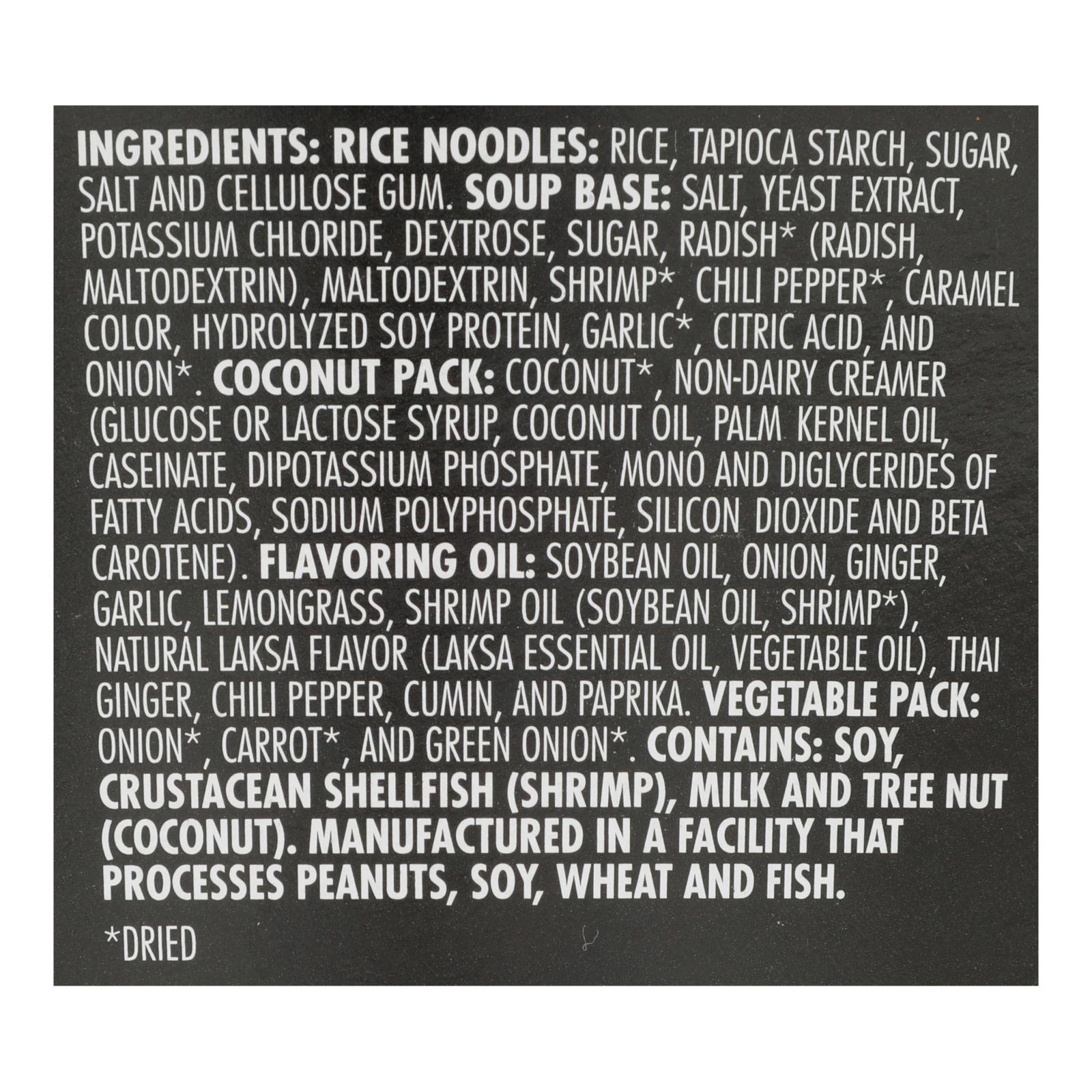 ingredients : rice noodles: rice, tapioca starch, sugar, salt and cellulose gum;soup base: salt, yeast extract, potassium chloride, dextrose, sugar, radish* (radish, maltodextrin), maltodextrin, shrimp*, chili pepper*, caramel color, hydrolyzed soy protein, garlic*, citric acid, and onion;coconut pack: coconut*, non-dairy creamer (glucose or lactose syrup, coconut oil, palm kernel oil, caseinate, dipotassium phosphate, mono and diglycerides of fatty acids, sodium polyphosphate, silicon dioxide and beta carote