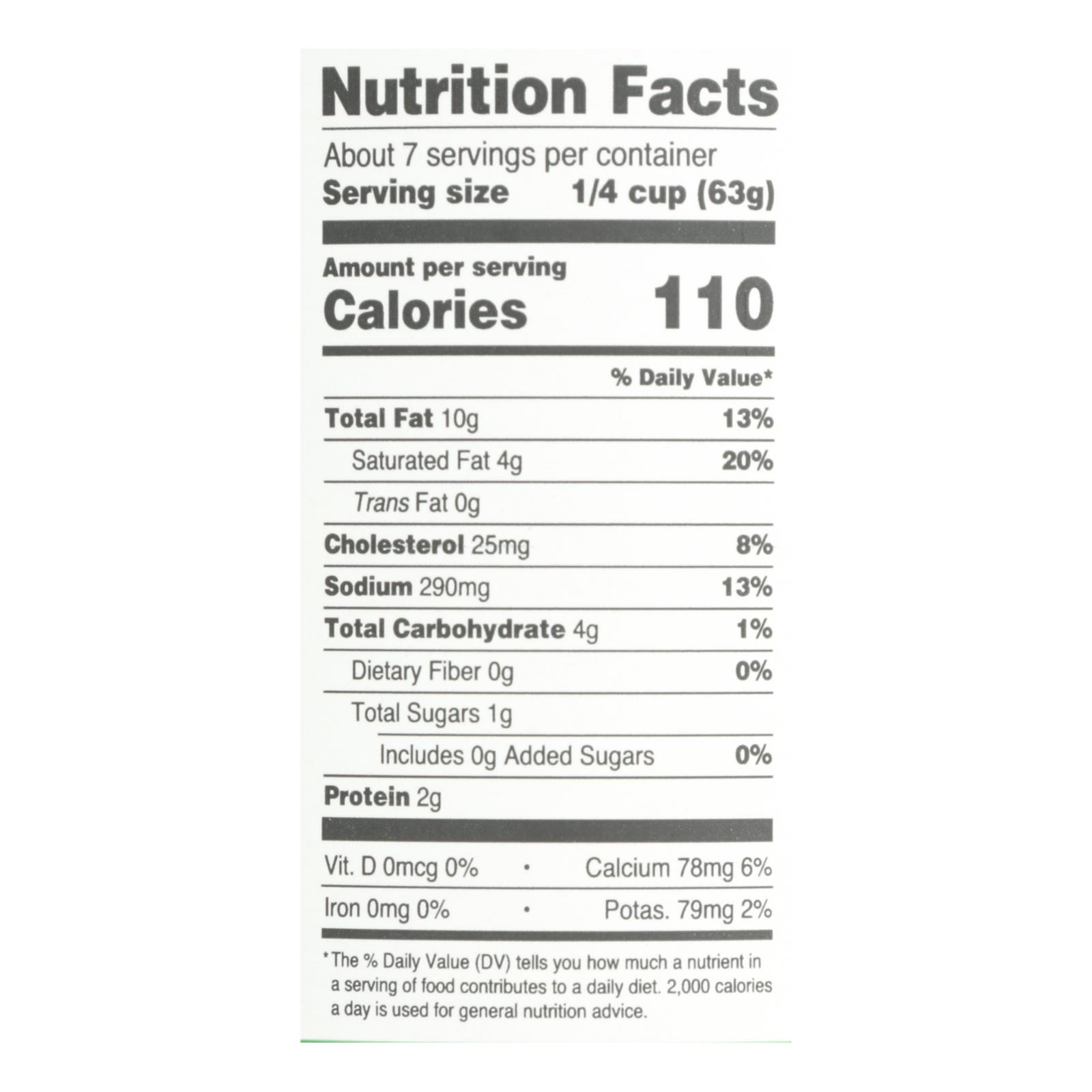 ingredients : organic vegetable stock (water, organic vegetable broth concentrate [organic carrot, organic celery, organic onion], sea salt, organic onion powder);cream;cultured buttermilk;spinach;sunflower oil;parmesan and romano cheeses (pasteurized milk, cheese culture, salt, enzymes);natural flavor;rice starch;garlic;sea salt;shallots;anchovies (anchovies, salt, olive oil, acetic acid);onion powder;citric acid;xanthan gum