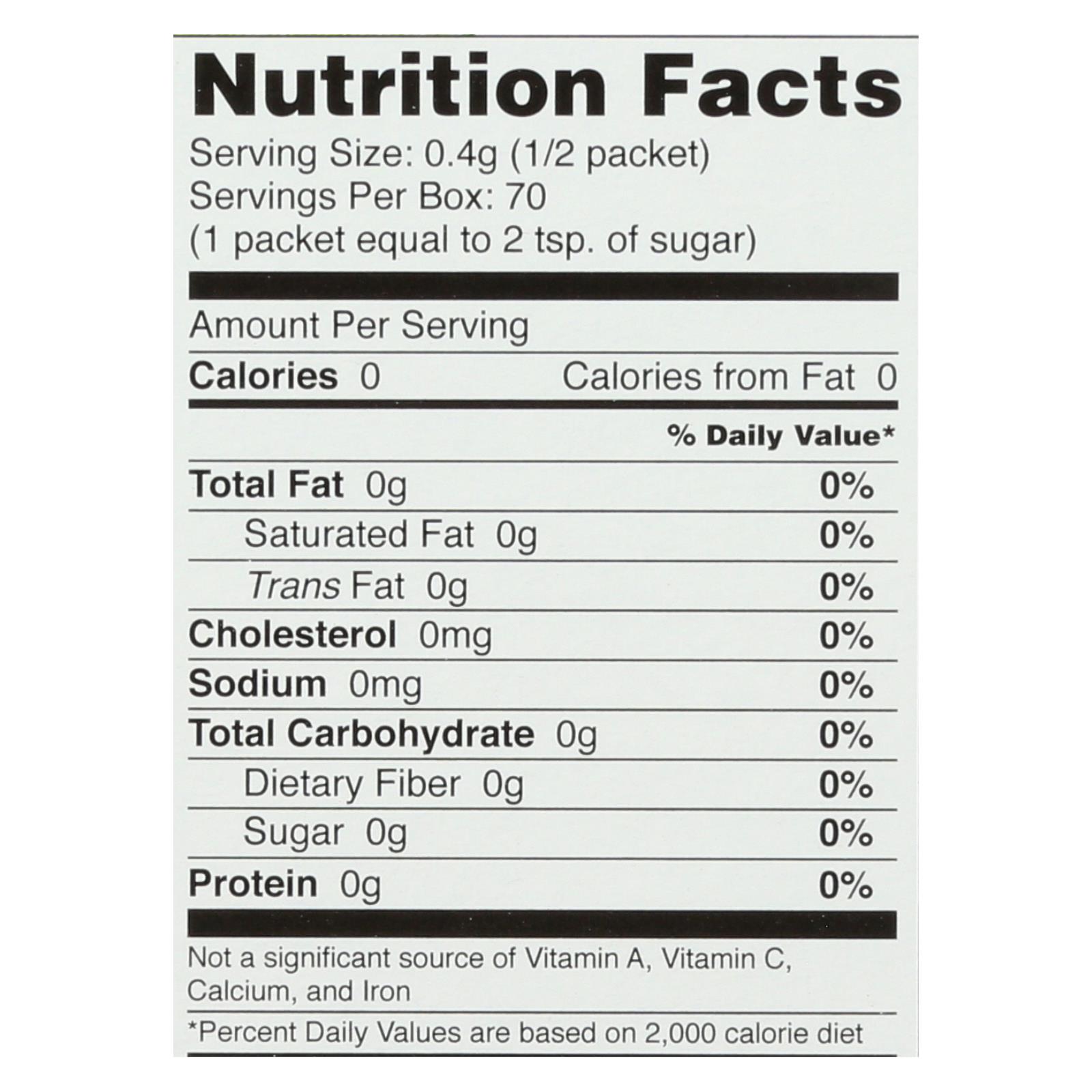 Sweetleaf organic stevia sweetener, 35 count box contains 35 packets of all-natural stevia-based sweeteners that are zero calories, gluten-free, non-gmo and offer a non-glycemic response. It’s made with certified organic sweet leaf stevia extract. Each packet is as sweet as two sugar packets, so start with half a packet and adjust for taste.