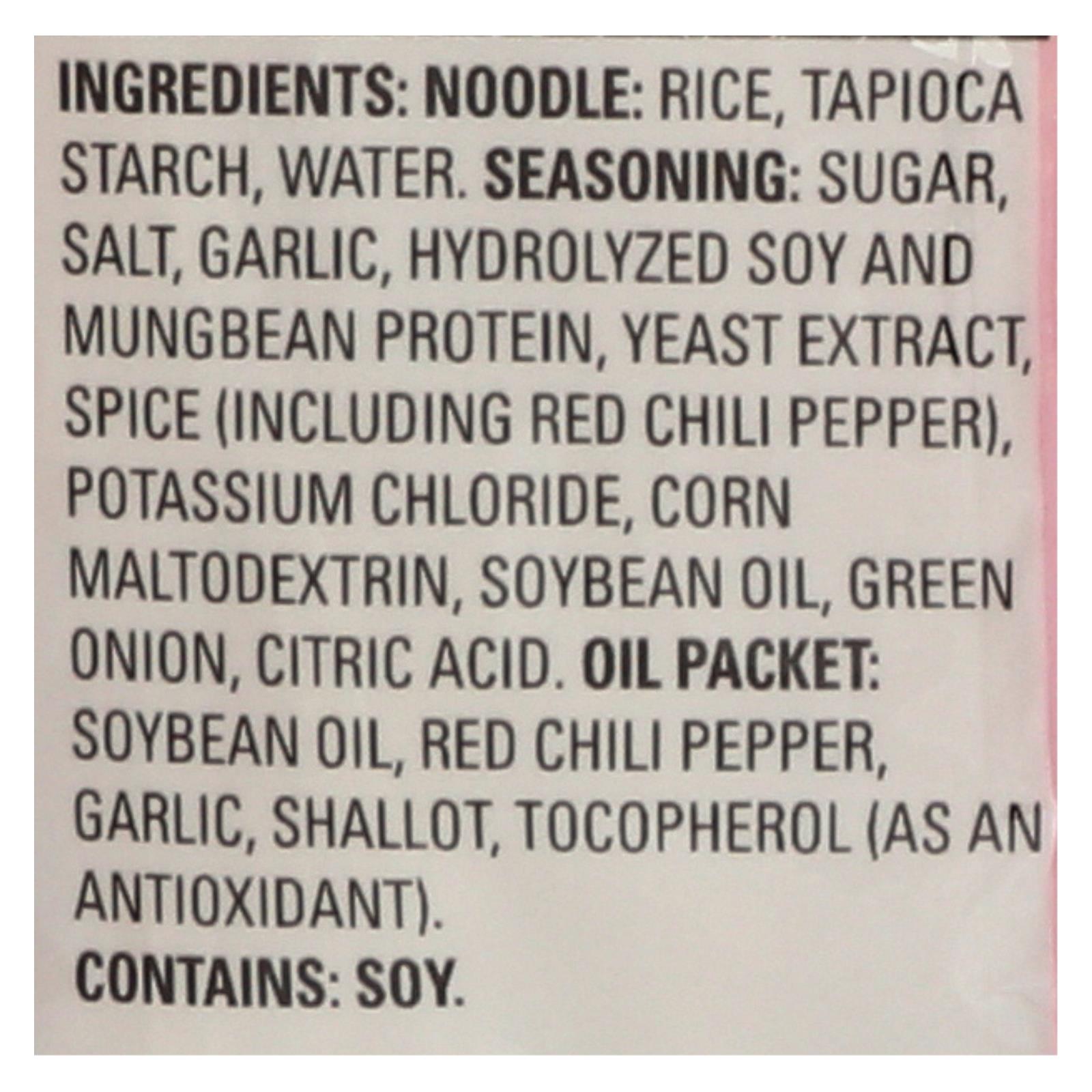 ingredients : noodle: rice;tapioca starch;water. Seasoning: sugar;salt;garlic;hydrolyzed soy and mungbean protein;yeast extract;spice;including red chili pepper;potassium chloride;corn maltodextrin;soybean oil;green onion;citric acid. Oil packet: soybean oil;red chili pepper;shallot;tocopherol;as an antioxidant