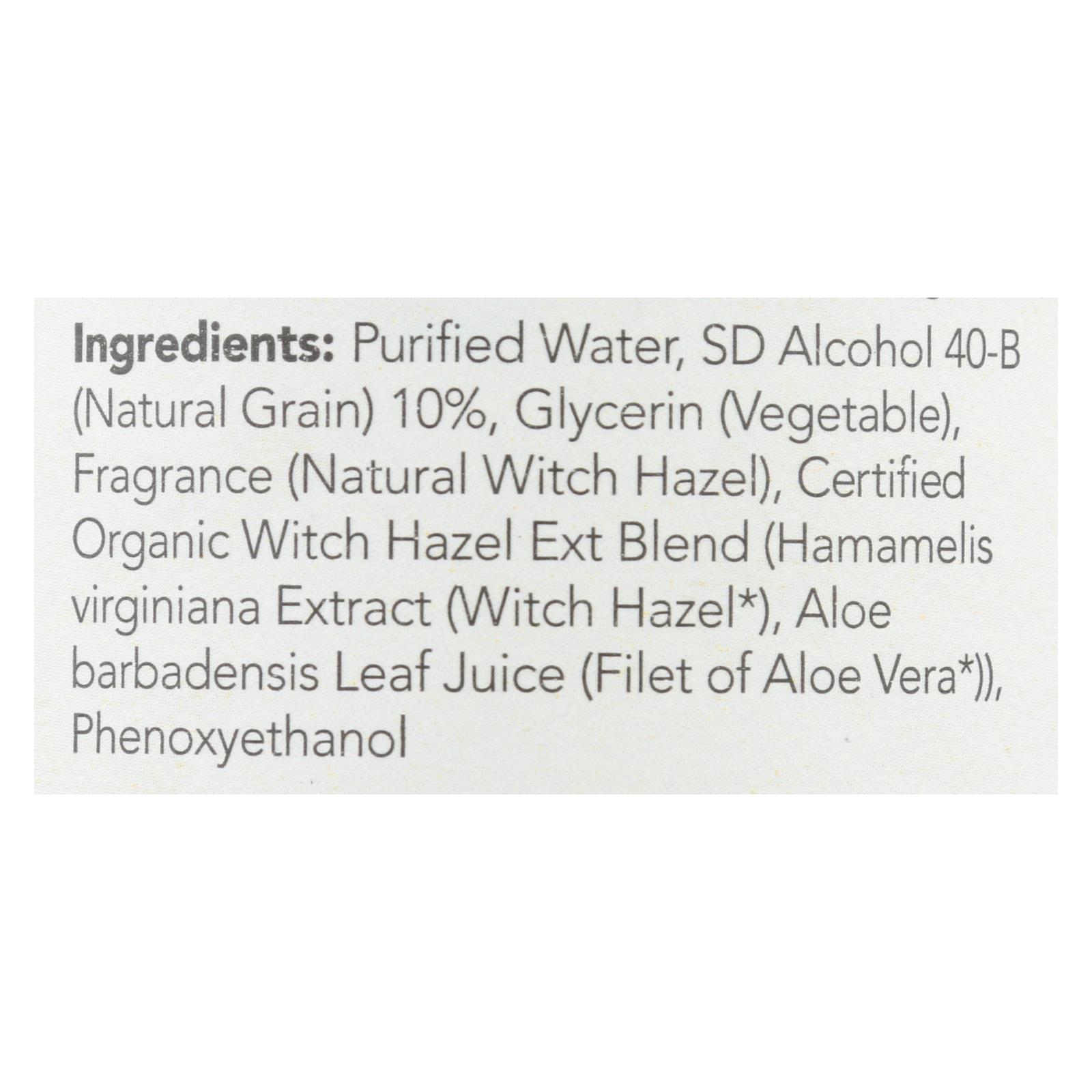 ingredients : purified water;sd alcohol 40-b;natural grain;10%;glycerin;vegetable;fragrance;natural witch hazel;certified organic witch hazel ext blend;hamamelis virginiana extract;witch hazel;aloe barbadensis leaf juice;filet of aloe vera;phenoxyethanol