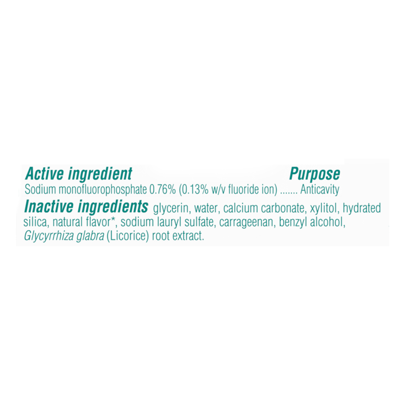 ingredients : glycerin;water;calcium carbonate;xylitol;hydrated silica;natural flavor;sodium lauryl sulfate;carrageenan;benzyl alcohol;glycyrrhiza glabra (licorice) root extract;sodium monofluorophosphate 0;76% (0.13% w/v fluoride ion) purpose anticavity