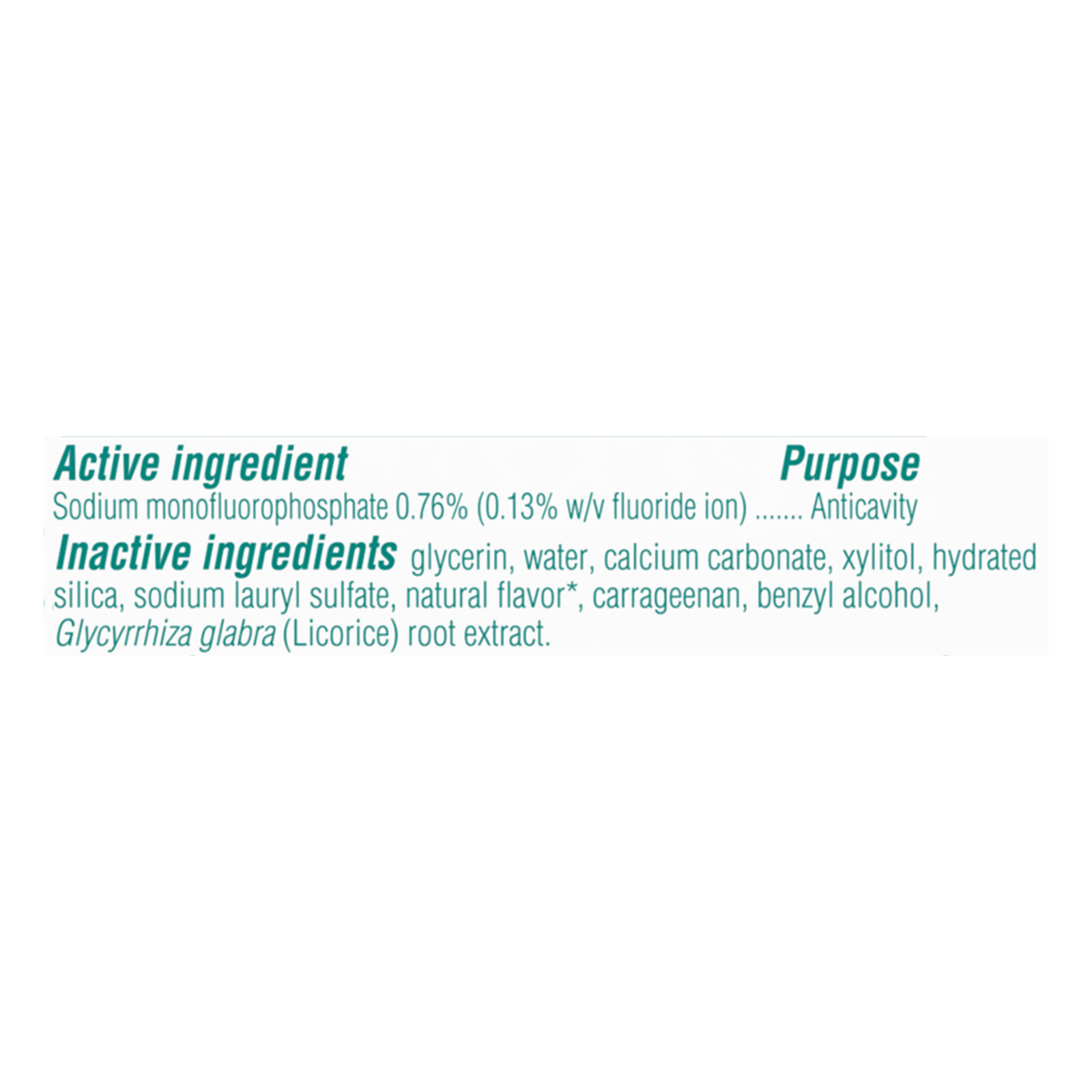 ingredients : glycerin;water;calcium carbonate;xylitol;hydrated silica;sodium lauryl sulfate;natural flavor;carrageenan;benzyl alcohol;glycyrrhiza glabra (licorice) root extract;sodium monofluorophosphate 0;76% (0.13% w/v fluoride ion) purpose anticavity