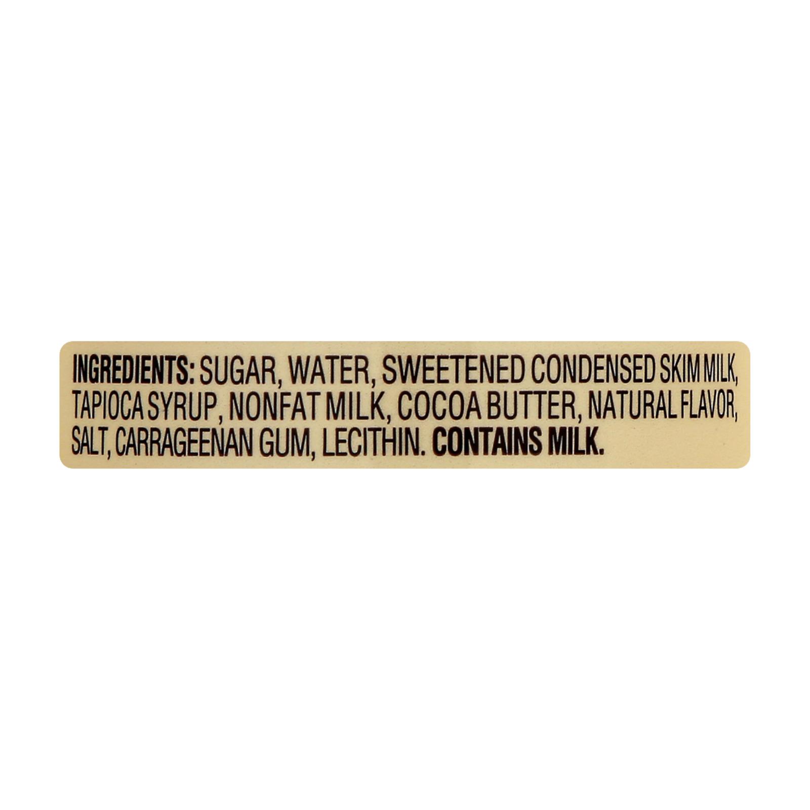 ingredients : sugar;water;sweetened condensed skim milk (skim milk, sugar);tapioca syrup;nonfat milk;cocoa butter;less than 1% of natural flavors;salt;carrageenan;gum;canola lecithin