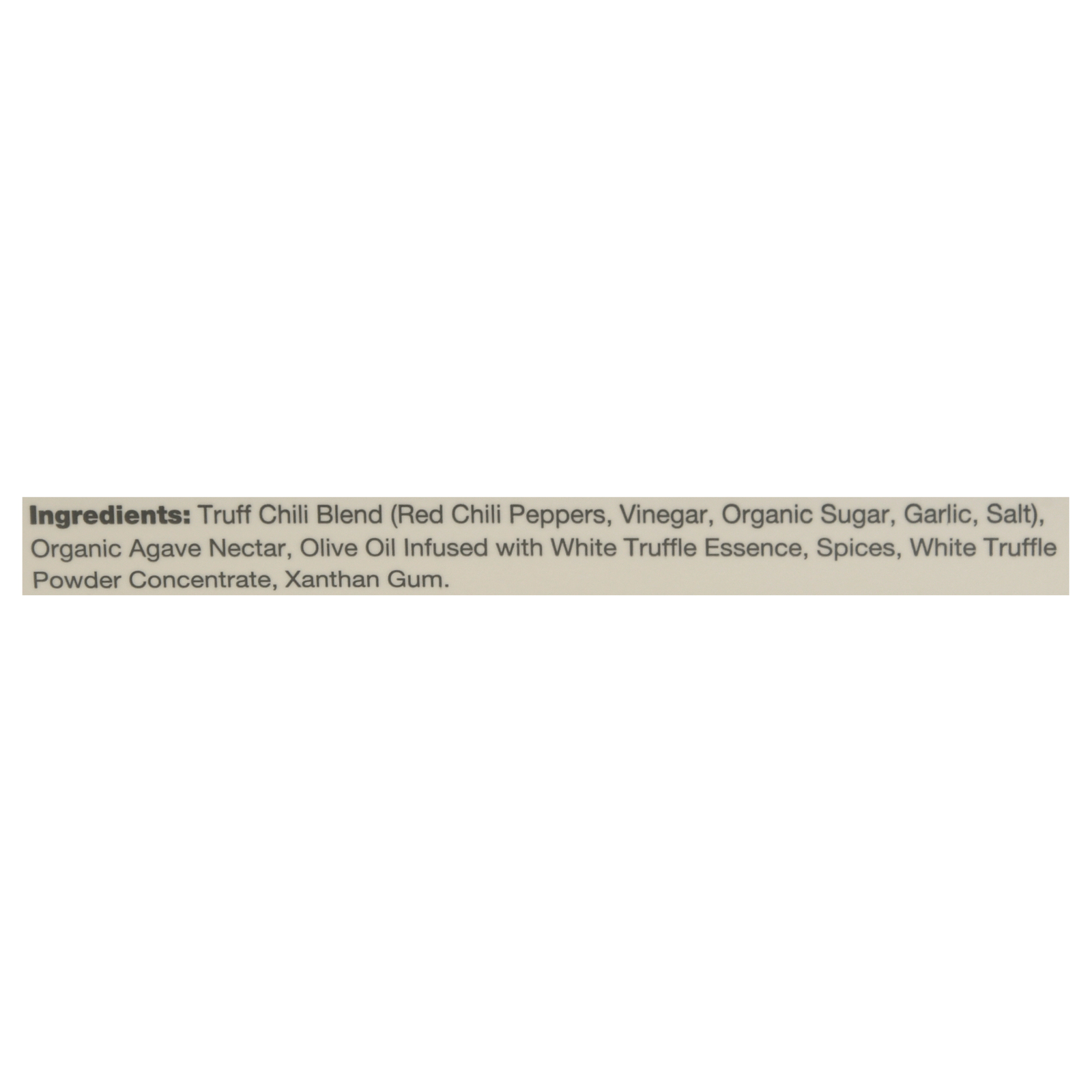 ingredients : truff® chili blend (red chili peppers, water, vinegar, organic sugar, garlic, salt);organic agave nectar;olive oil infused with white truffle essence;spices;xanthan gum;white truffle powder concentrate;white truffle (tuber magnatum)
