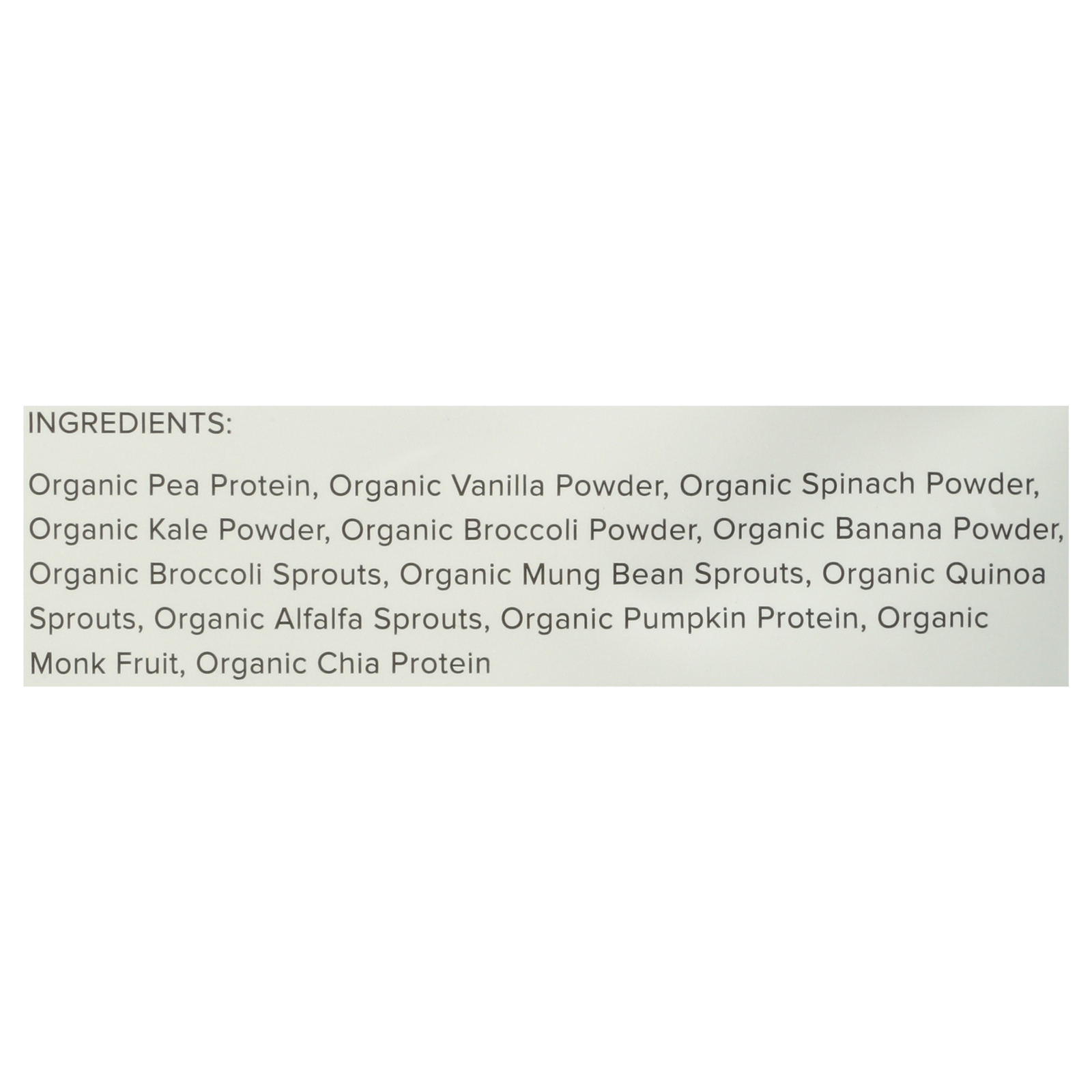 ingredients : organic pea protein;organic vanilla powder;organic spinach powder;organic kale powder;organic broccoli powder;organic banana powder;organic broccoli sprouts;organic mung bean sprouts;organic quinoa sprouts;organic alfalfa sprouts;organic pumpkin protein;organic monk fruit;organic chia protein